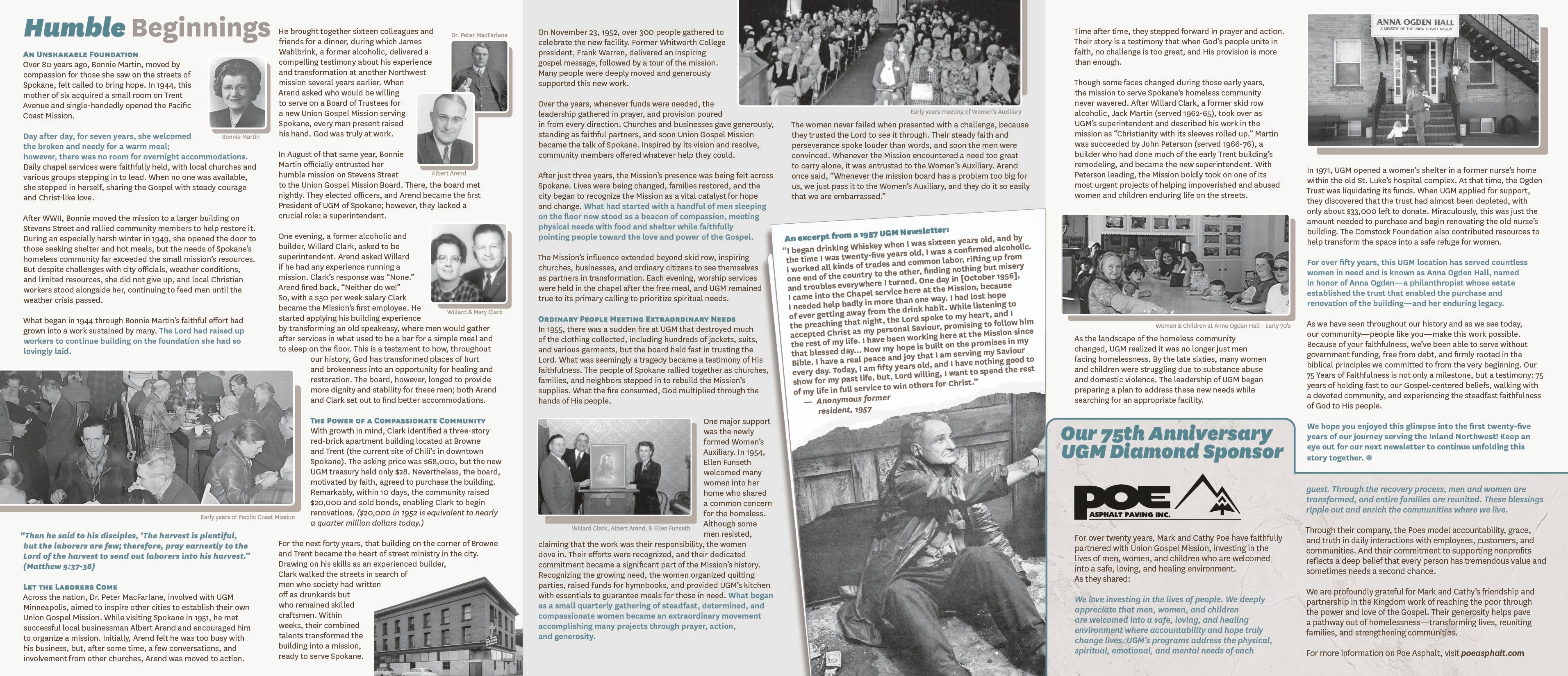 Join us as we celebrate the 75th Anniversary of Union Gospel Mission of the Inland Northwest. Established in Spokane, WA in 1951, UGM is one of the oldest non-profits in the area and is a pioneer in serving those struggling with homelessness and addiction in our communities. As 2026 unfolds, we will look at UGM’s remarkable history and how God has used a humble mission to transform many lives across the Inland Northwest. Please continue to visit this page to learn about our journey and upcoming community events as we celebrate.